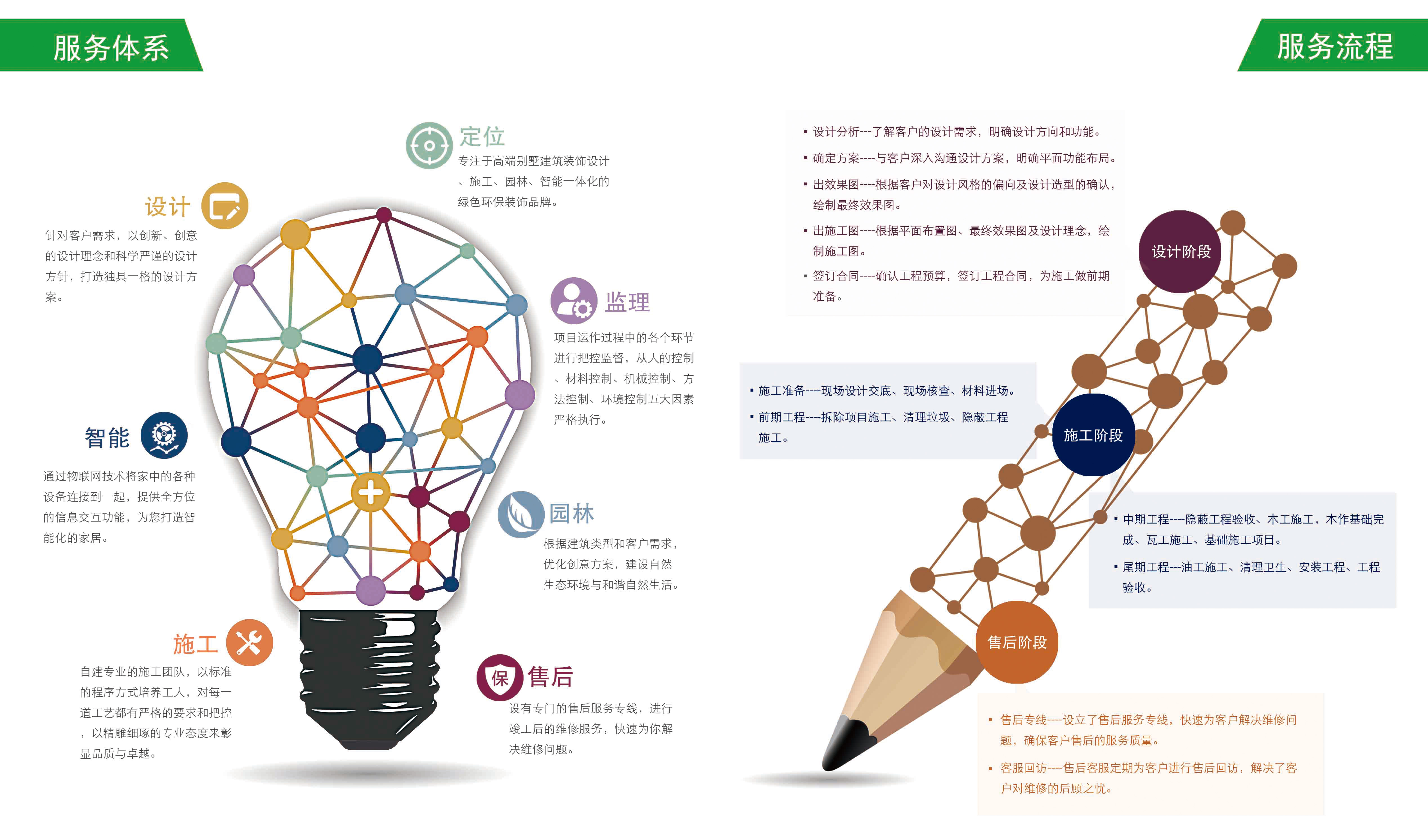 企业将继续强化自身实力,坚持“与时俱进,开拓创新”的发展思路,进一步整合现有资源,吸纳、学习先进设计理念,强调工艺、材料和智能研发,不断延展、完善服务产业链,提升综合服务水平,打造集设计、施工、园林、智能、建材选购、材料配送、售后服务于一体的完善服务体系,为广大客户打造更高品位的建筑装饰工程。推动企业向一体化、产业化、品牌化、集团化全方位。