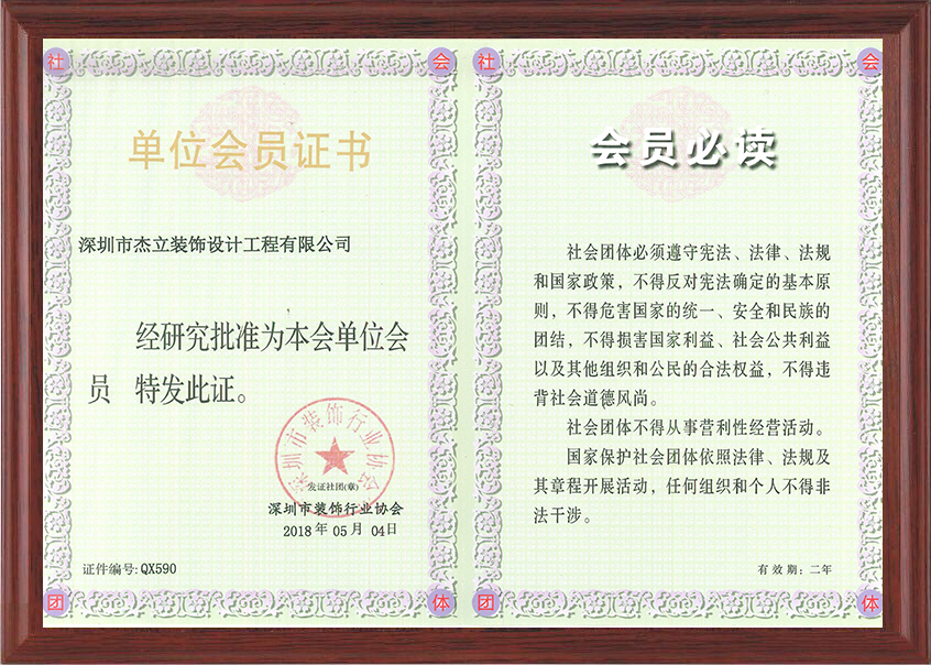 近日,杰立装饰正式成为深圳装饰行业协会会员单位,荣获新章,杰立装饰品牌战略快速推进,稳步迈进全国前列。